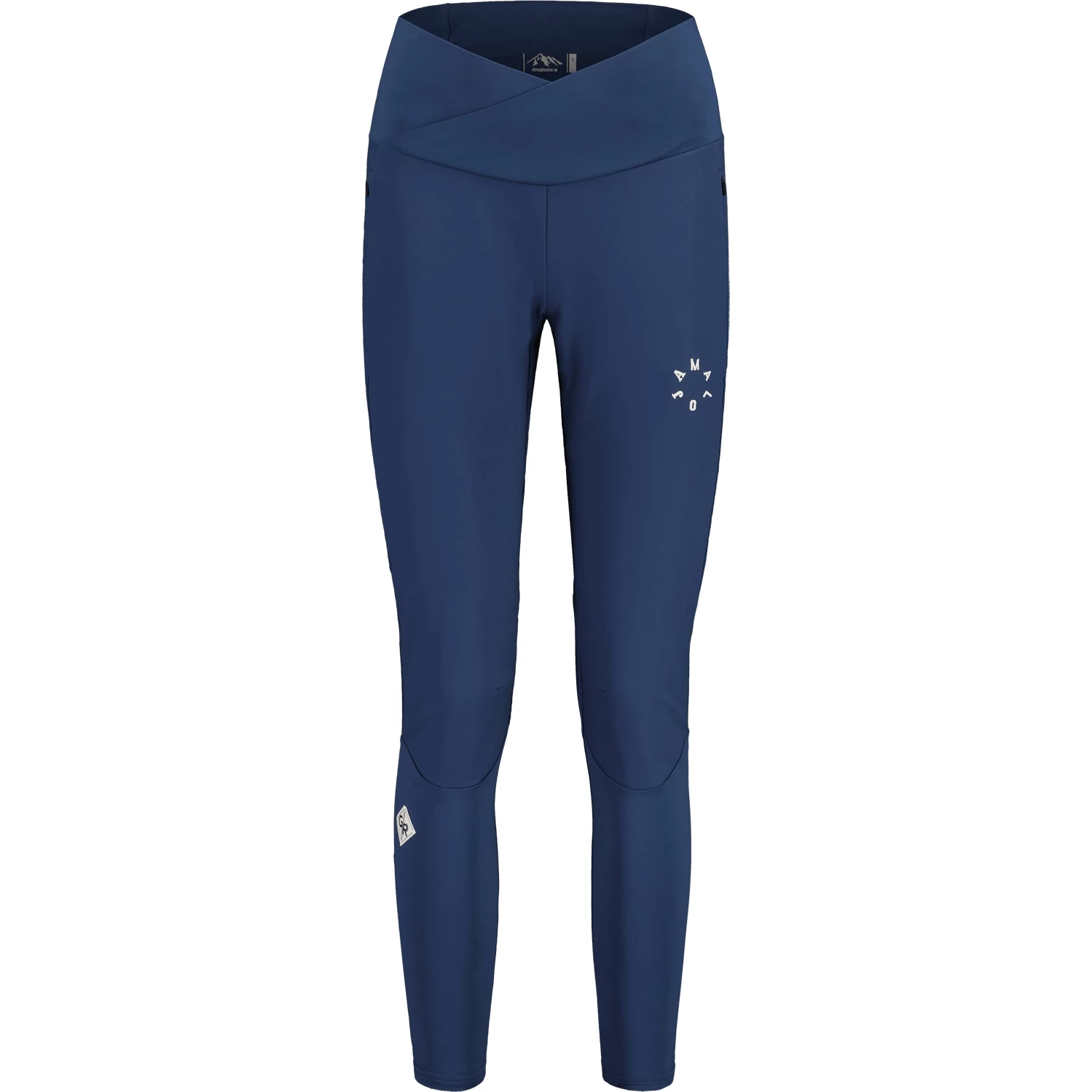 Twee zijzakken met rits en een zakje voor je smartphone, sterren over de onderkant, ronde Maloja-letters boven de linkerzak, Glide&Ride-patch op de kuit.
