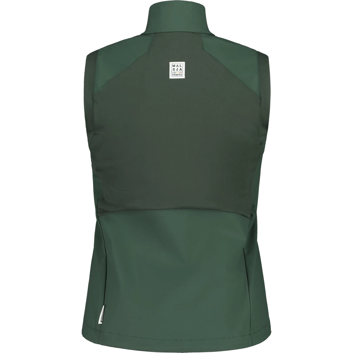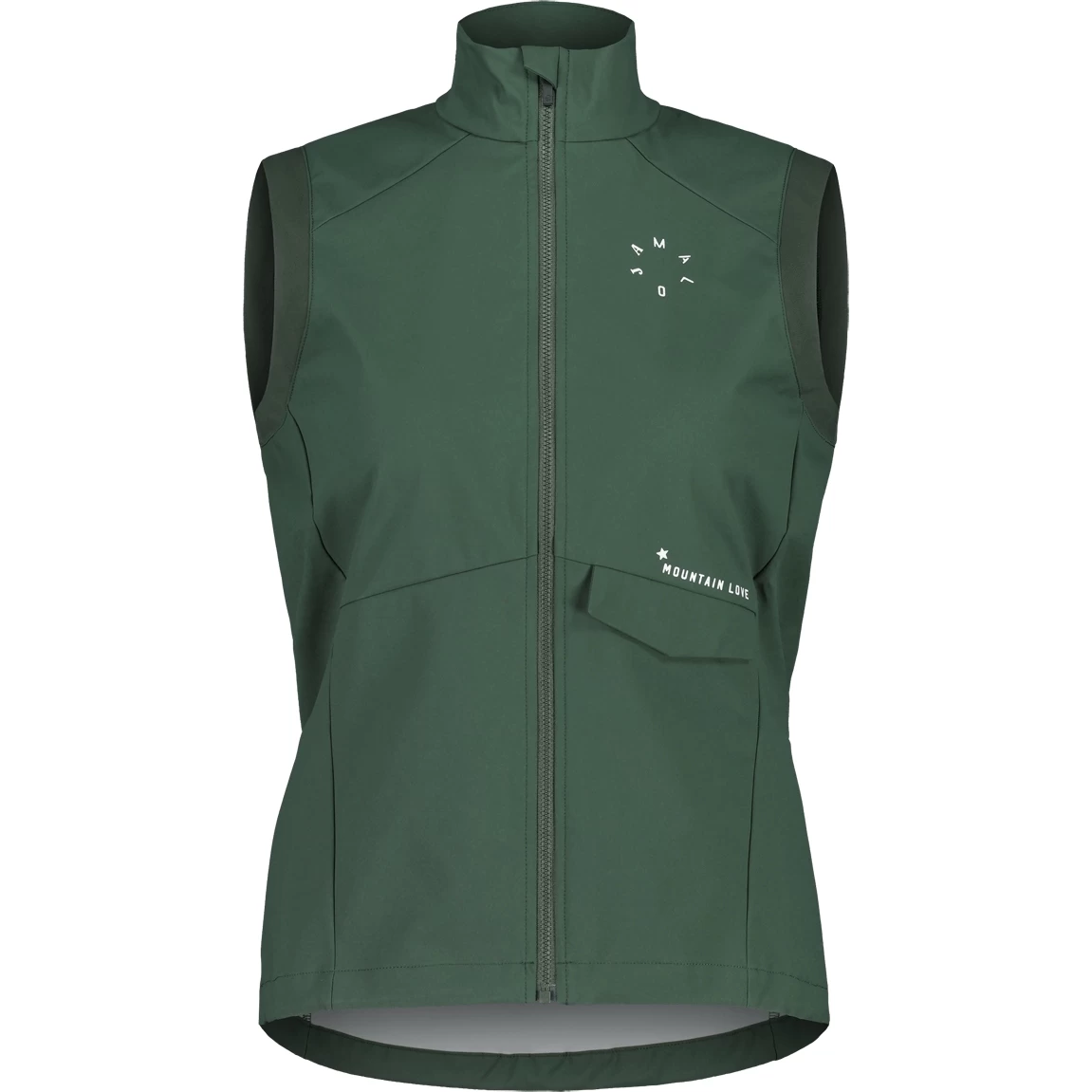 Het multifunctionele vest biedt goede windbescherming dankzij het Stormshell Light materiaal op de voorkant en schouders. Hoge kraag, verstelbare tailleband en een klepzak voor smartphone, Mountain Love opschrift boven. Rond Maloja opschrift op de borst.
