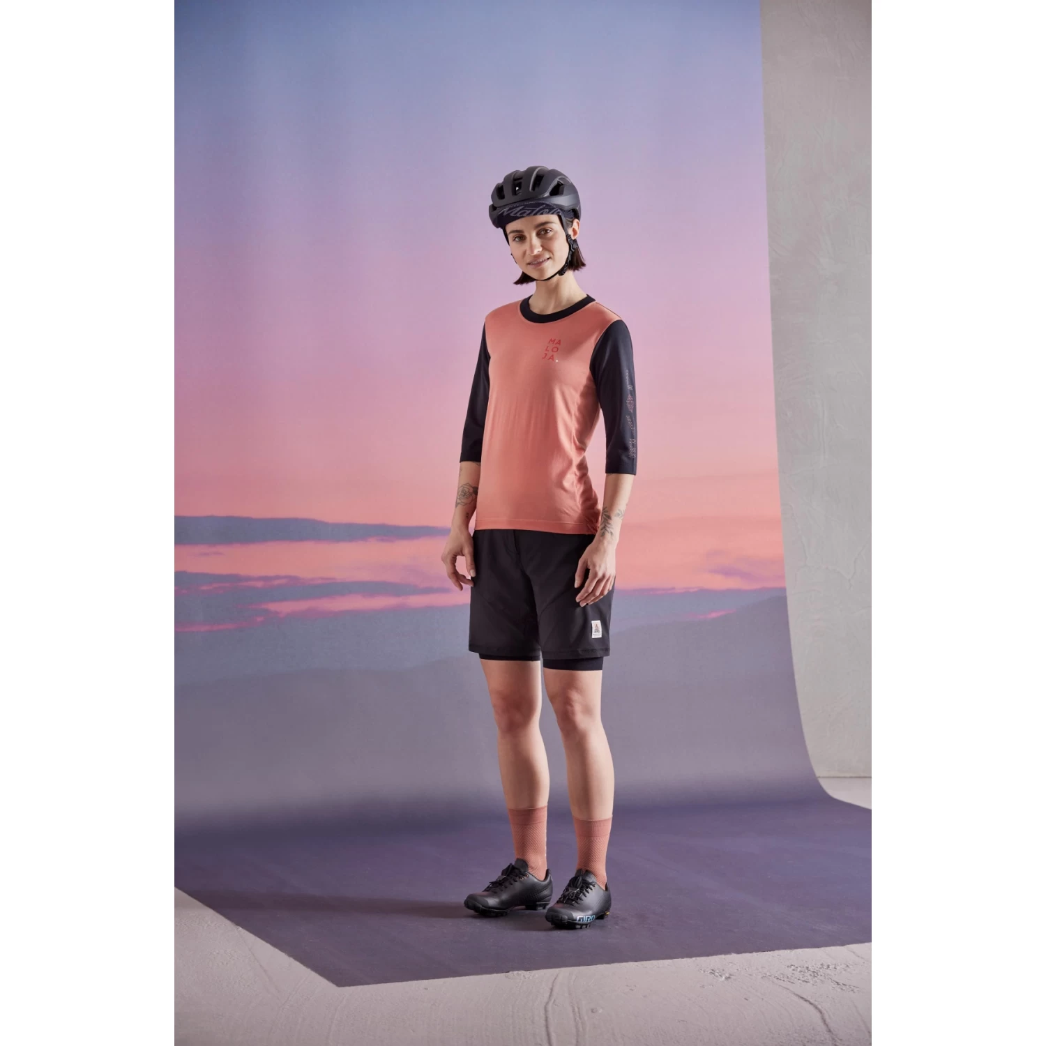 De kleurcontrasterende 3/4-mouwen en het natuurlijke materiaalgevoel geven het Gravel-shirt een urban look. Siliconenrand voor een goede pasvorm op de fiets, sneldrogend materiaal, drie achterzakken.