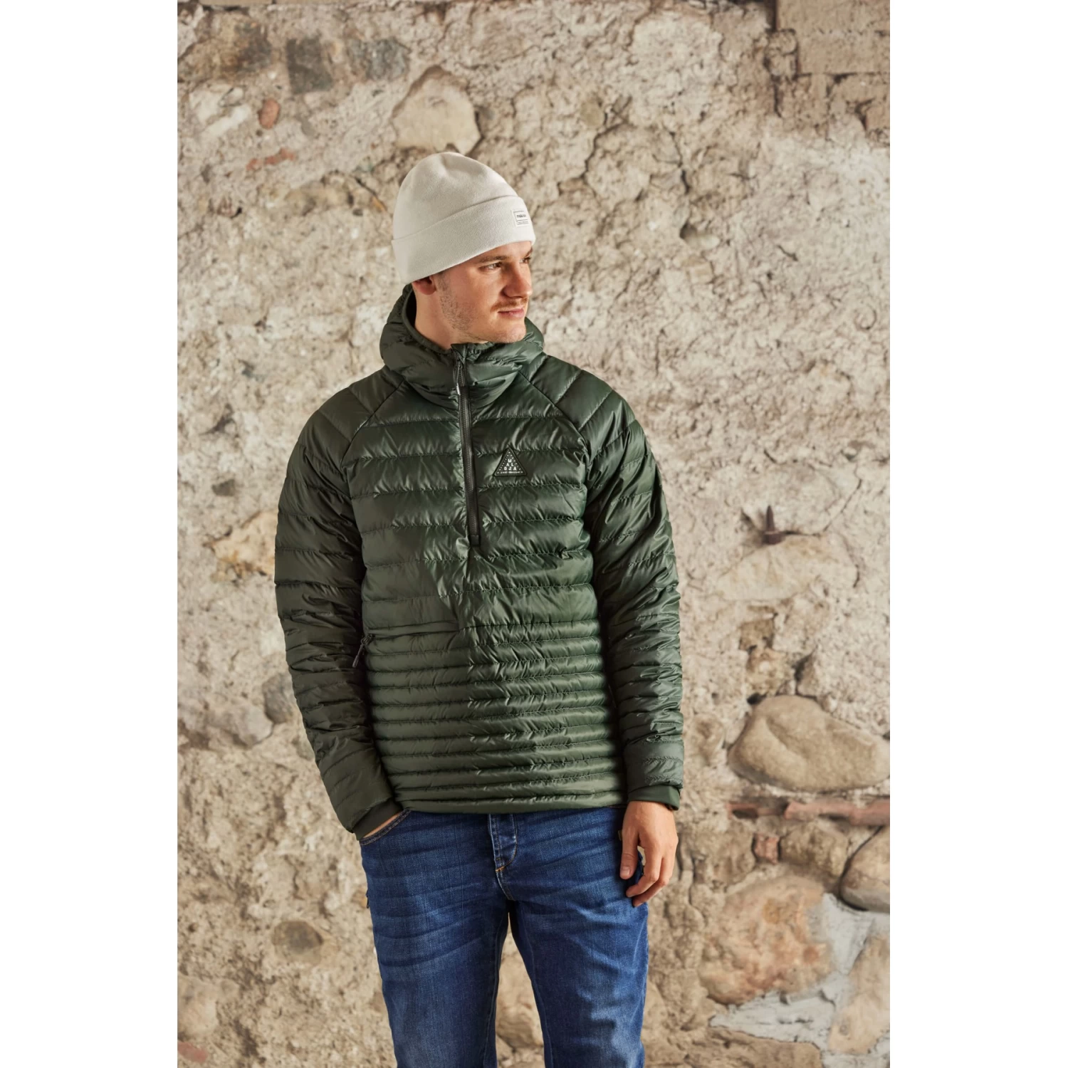 Slipjack met capuchon en gerecyclede donsvulling, opening met rits aan de voorkant, zijsplitopening in de zijnaad, kleine zak met verborgen rits. De iso-layer is winddicht en kan klein worden opgeborgen in de zak, dus hij werkt solo of als tweede laag onder een shell – als een sportieve metgezel in de stad of een lichte metgezel voor toertochten en outdoor.