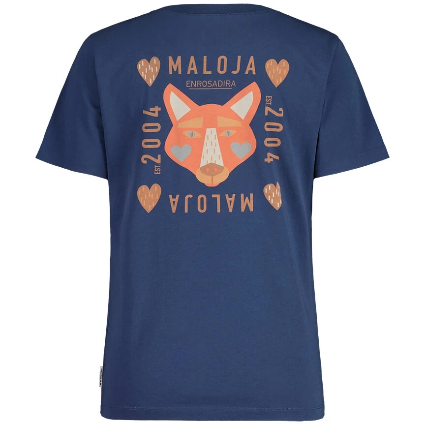 Basic T-shirt van biologisch katoen met grote vossenprint op de rug en Maloja-letters op de borst.