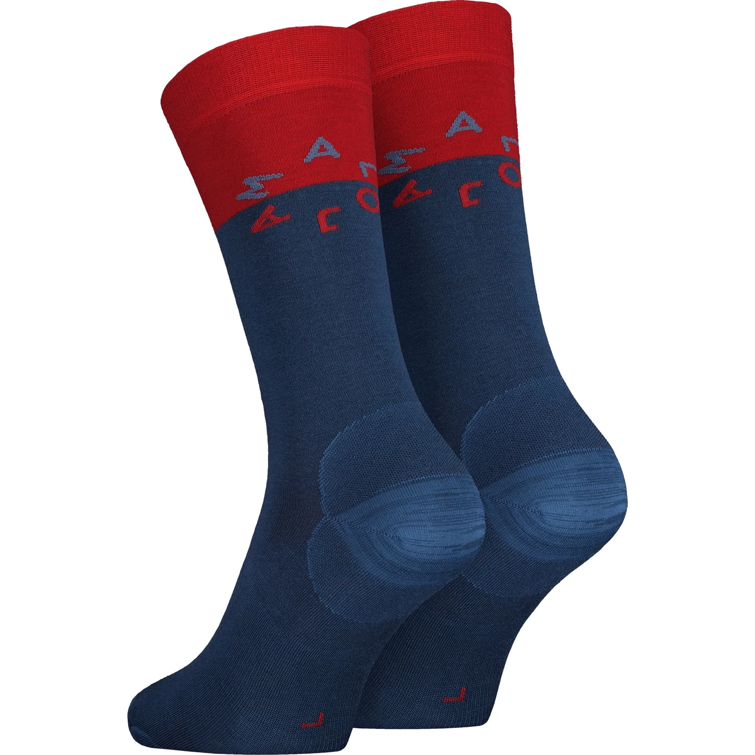 Moderne lengte sokken van merinomix in colourblock, ronde Maloja letters achter.