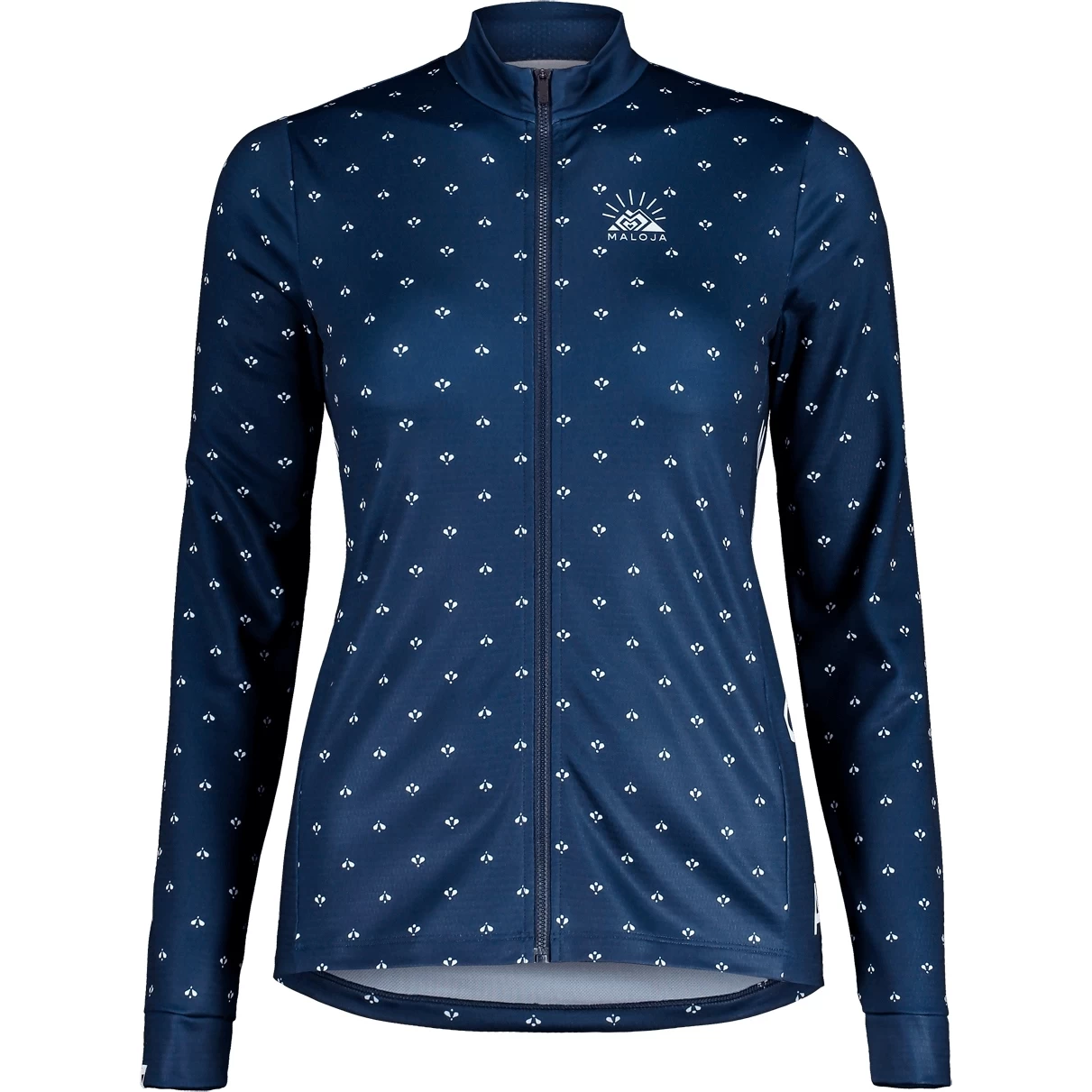 De verwarmende jas is gemaakt van sneldrogend, elastisch thermopeel materiaal. All-over hartjesprint, Maloja-letters naast de ritssluiting.
