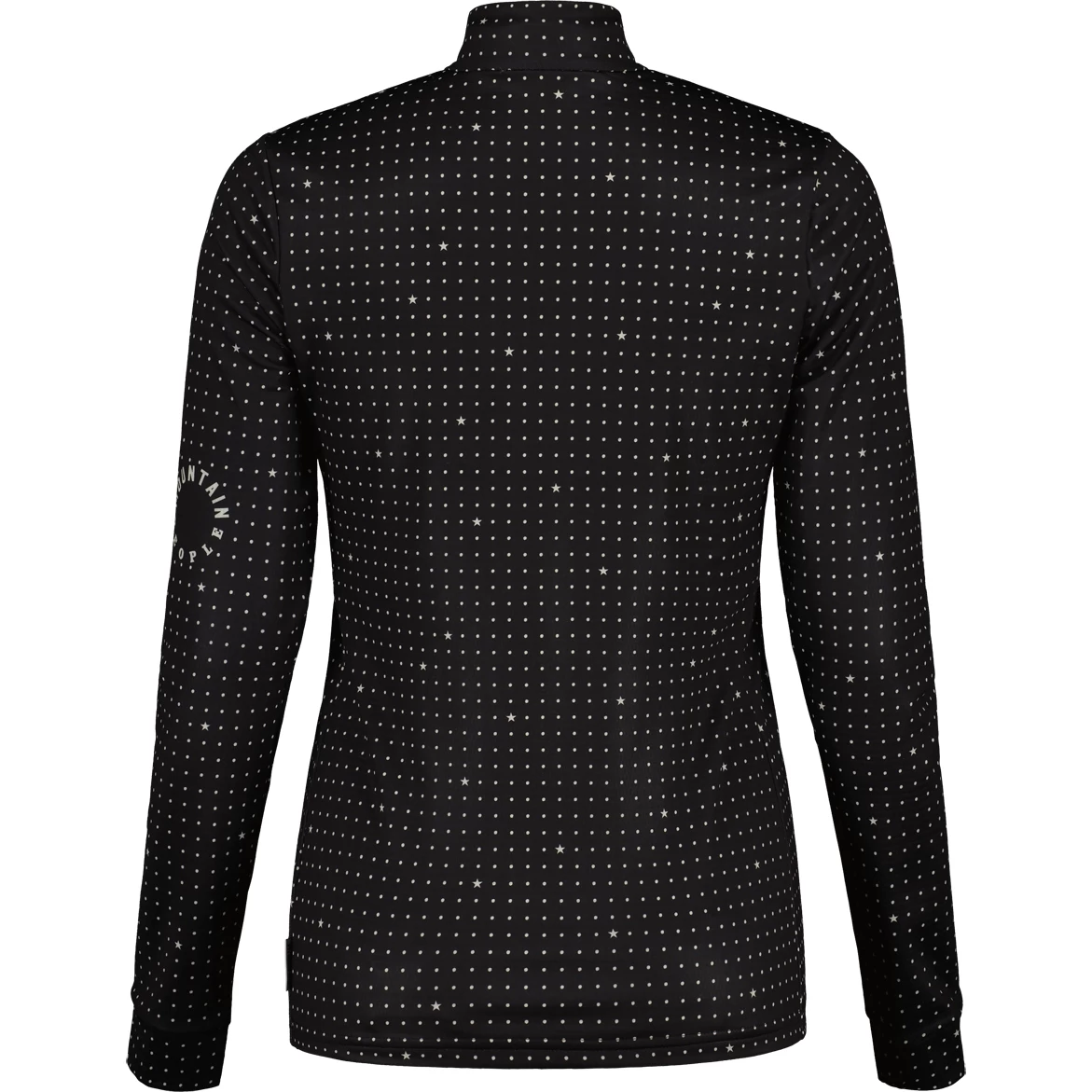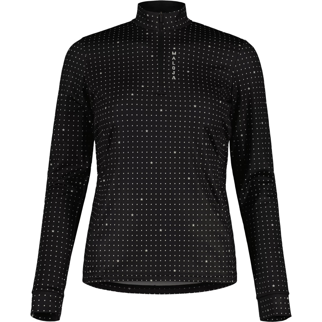 Het verwarmende shirt is gemaakt van sneldrogend, elastisch thermopeel materiaal en werkt perfect als tussenlaag voor veel buitenactiviteiten. All-over stippenrasterprint, Maloja-opschrift naast de korte ritssluiting.