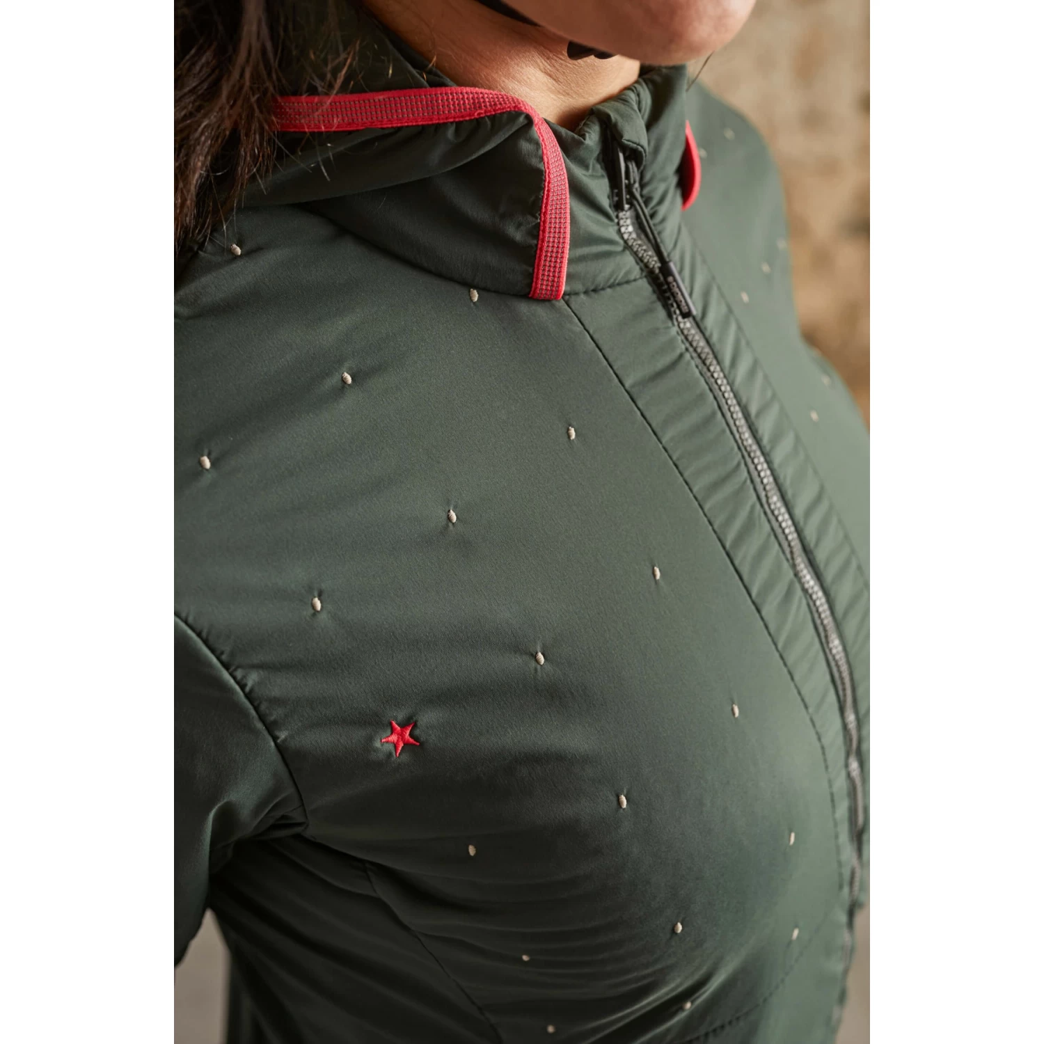 Reflecterende boorden aan de mouwen en capuchon, geborduurde sterren om de wattering vast te zetten, ronde Maloja letters op de linkerzak.